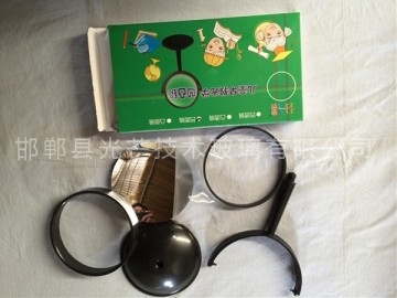 帶底座凹透鏡 直徑:10厘米 焦距:負300mm 幼兒園小朋友 或者中小學(xué)生認識凹透鏡的特點 學(xué)習(xí)凹透鏡光學(xué)原理的的器材 尺寸大也時候教師教學(xué)演示用教具 知識拓展閱讀: 凸透鏡與凹透鏡可以從以下幾個方面加以區(qū)別:外形特征、對光線的作用、成像特點及用途等。具體方法如下: 方法一:用手摸,鏡子的中央部分比邊緣厚的是凸透鏡,鏡子的中央部分比邊緣薄的是凹透鏡。 方法二:隔著鏡子觀察距鏡子較近的書上的字,有放大作用的是凸透鏡;字變小的是凹透鏡。 方法三:隔著鏡子觀察距鏡子較近的書上的字,移動鏡子,若發(fā)現(xiàn)像的移動方向總是與鏡子的移動方向相同,則該鏡子是凹透鏡;若發(fā)現(xiàn)像的移動方向總是與鏡子的移動方向相反,則該鏡子是凸透鏡。 方法四:隔著鏡子觀察窗外的物體,若能看到上下左右都顛倒的像,這種鏡子是凸透鏡;若看到像是正立的,這種鏡子是凹透鏡。 方法五:將點燃的蠟燭放在離透鏡適當(dāng)距離處,在另一側(cè)光屏上能得到倒立實像的是凸透鏡;無論怎樣調(diào)節(jié),在另一側(cè)光屏上不能得到像的是凹透鏡。 方法六:讓鏡子正對太陽光照射,在鏡子的另一側(cè)放一張與透鏡平行的白色卡片紙,耐心調(diào)節(jié)鏡子與紙之間的距離,能得到一個小亮點的是凸透鏡;始終不能獲得小亮點的是凹透鏡。 方法七:觀察陽光通過了兩副眼鏡在地面上形成的光斑,若形成光斑的中間比四周明亮,則鏡子是凸透鏡;若形成光斑的中間比四周暗,則鏡子是凹透鏡。 方法八:近視眼鏡,是用凹透鏡做成的。老花鏡,是用凸透鏡做成的。 說明:辨別凸透鏡與凹透鏡有好多方法,哪種方法好,要視具體情況而定。例如,如果待辨別透鏡的中央與邊緣的厚薄差異不明顯,就不能用“摸”的方法(況且精密光學(xué)儀器是不允許直接用手去摸的);在有太陽光與沒有太陽光的場合,所選的方法也不同??傊?,一種好方法,應(yīng)該簡便、易行、有效。它是隨場合變化而變化的,不宜一概而論。 技巧:當(dāng)你想要判別兩件事物的相同和不同之處時,就需要用比較與對比的方法。比較就是找出事物的相似性,即共同特征。對比是找出事物的不同點。用這種方法來分析事物,能幫助你發(fā)現(xiàn)一些平時容易忽略的細節(jié)。